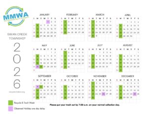 For example, if Christmas Day is on a Wednesday, collection services for Wednesday, Thursday and Friday will be one day later. Holidays that fall on a Saturday or Sunday do NOT delay collection services. Mid Michigan Waste Authority’s observed holidays are: New Year’s Day, Memorial Day, Independence Day, Labor Day, Thanksgiving, and Christmas.